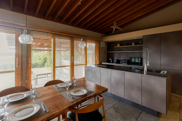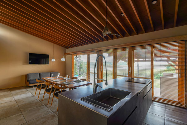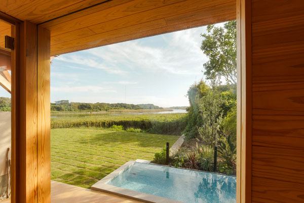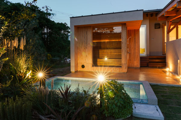 外房の海が育んだ自然の堤防に守られたラグーンに面して建つ弊社直営のレンタルバケーションハウスです。明治の頃より森鴎外をはじめとする文豪に愛された歴史ある別荘地に位置し、この地の風景と時間を継承する建築を目指した。建物はラグーンを一望する眺望を最大限に生かし、家族や友人とともに特別な時間を過ごす場として計画しました。シンプルな意匠にどこかノスタルジーを漂わせつつ、内部と外部をつなぐBBQハウスや、ラグーンを望むサウナ・露天の水風呂を設け、自然を五感で享受できる設えとしました。自然と調和し歴史に寄り添うこの場所で、宿泊者はそれぞれの物語を紡ぎ、新たな記憶を刻んでいくことを期待します。